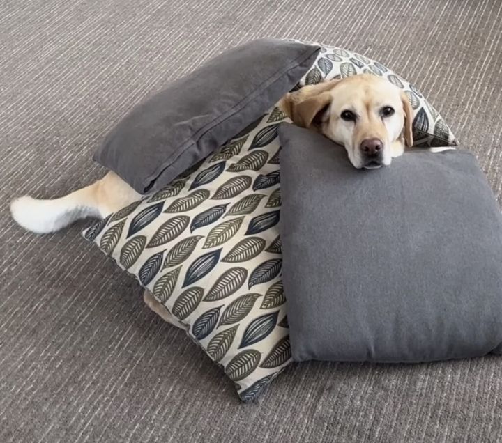 3. クッション大好きワンコ! せっせとクッションを集めて