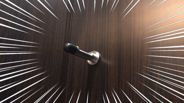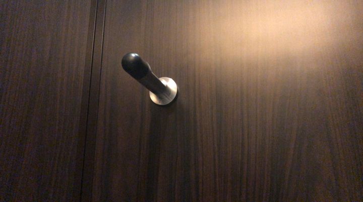 そう、このドアについているフックらしきものは、ドアストッパーだったのです!そう言われると、「重い荷物をかけないでください」という貼り紙や、壁に頑丈そうな荷物用フックを作っている意味も納得できました!