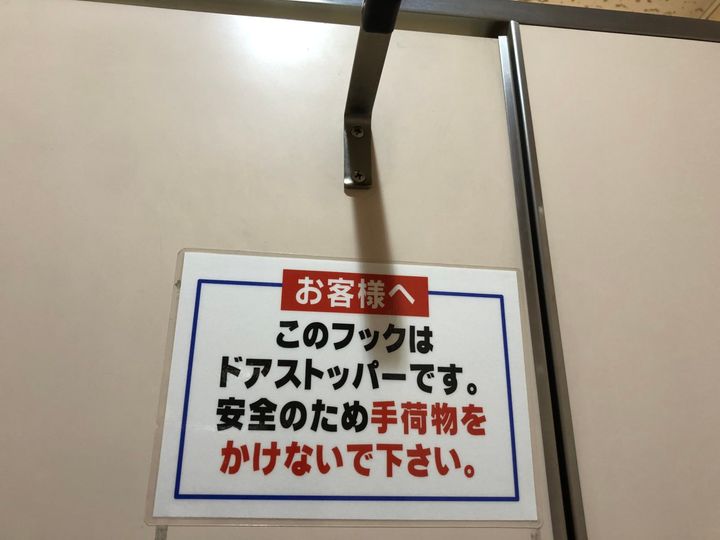 公衆トイレのドアを閉めると個室側によく、フックみたいなものがついていますよね。店によっては、ドア側のフックには「重いものはかけないでください」と注意書きがあったり、壁側にも別にカバン掛けがあったりすると思うのですが、ドア側のフックにも軽いものであれば、荷物をかけてよいのかと勝手に思い込んで今まで使っていました。