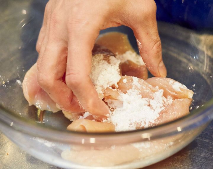 パサつきがちな鶏ささ身は塩、砂糖、片栗粉を順にもみ込み、水分をキープ。しっとりと口当たりよく仕上がります。