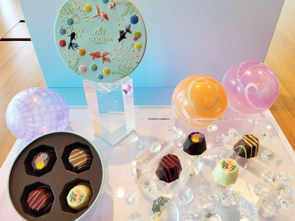 「ゴディバ サマー コレクション -夏まつり-」(4粒入り1,944円 ※8粒入りもあり)は、夏まつりをイメージした「アップル&キャラメル」「ストロベリー&ウォーターメロン」「レモン&ブラッドオレンジ」「ピーチ&ダークチョコレートガナッシュ」4種の限定チョコレートがイン。