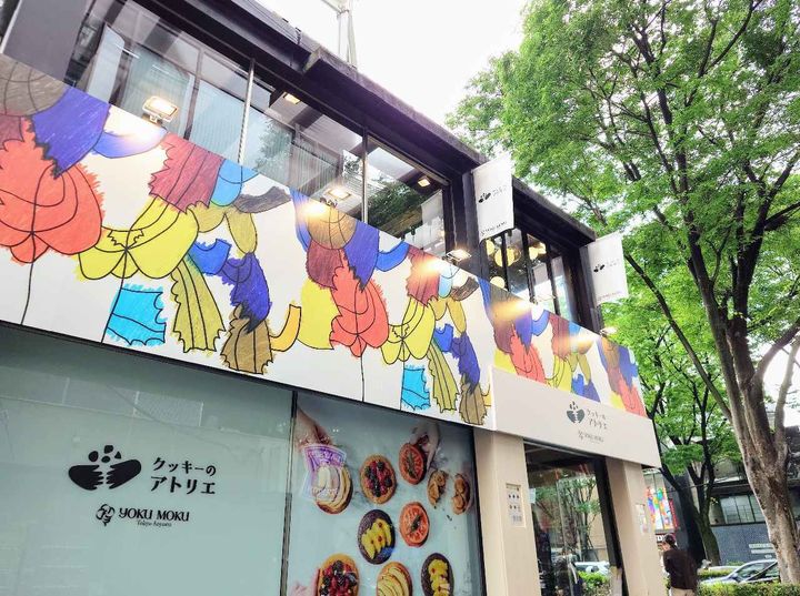 また、「クッキーパレット」全5種類を完食した小林さんが、クッキーやヨックモックからインスピレーションを受けて、赤、青、黄と色を塗った作品「共につなぐ、未来へ」も、お店の外観を彩っています。このカラフルさもお店の目印ですね!