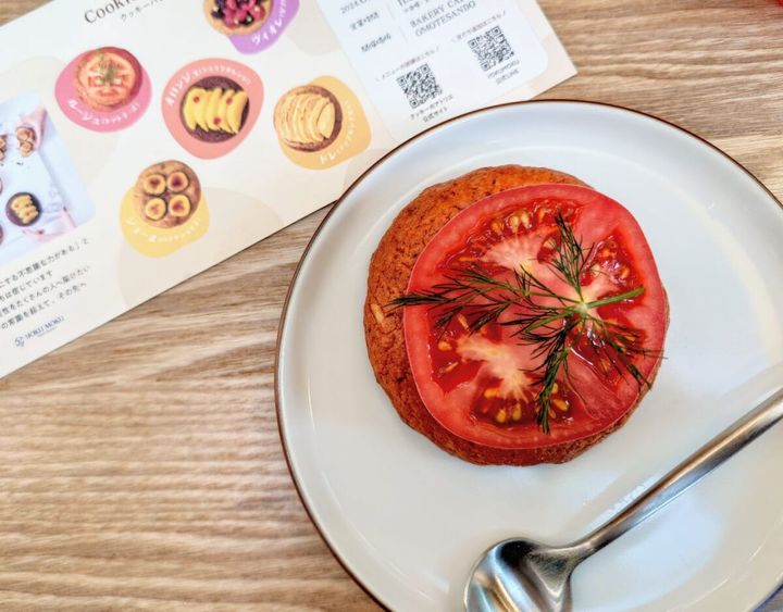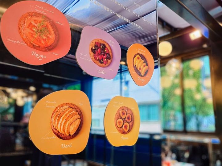 タルトやパイを重ねた2層の焼きたてクッキーに果物や野菜などをのせた「クッキーパレット」(3種/税抜500円)。各商品の名前は、パレットにちなんで「赤・オレンジ・紫」など象徴的な色味をフランス語でアーティスティックに表現。1枚もアメリカンクッキーのように大きいです!