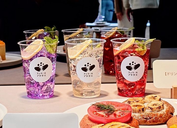 ドリンクは、(左から)「バタフライピーティー」「レモネード」「ハイビスカス&ローズヒップティー」(税抜各500円)と、クリアな色彩の3種類。