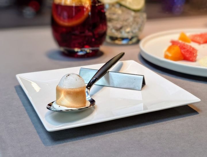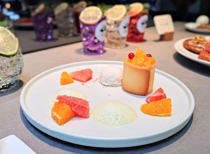 1品目は、フランス語で“やわらかい”を意味する「ムー」。軽やかなラングドシャーに2層のチーズケーキ、ライムの泡、オレンジやピンクグレープフルーツ、いちごのアイスクリームなどを盛り合わせたキュートで初夏らしいプレート。