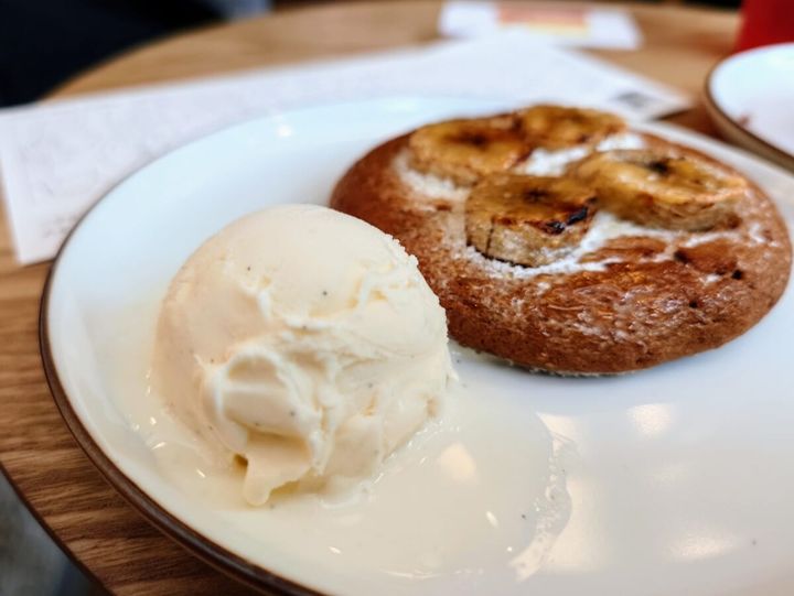 カリッザクッとしたハードな食感のクッキーで、中ではチョコチップがとろっとお目見え。バナナもほわっと温かくやわらかく、濃厚な味わい。時間と共にだんだんとけてクッキーに染みてゆくバニラアイス……。少ししっとりしたクッキーの食感の変化も楽しんでほしいものです!