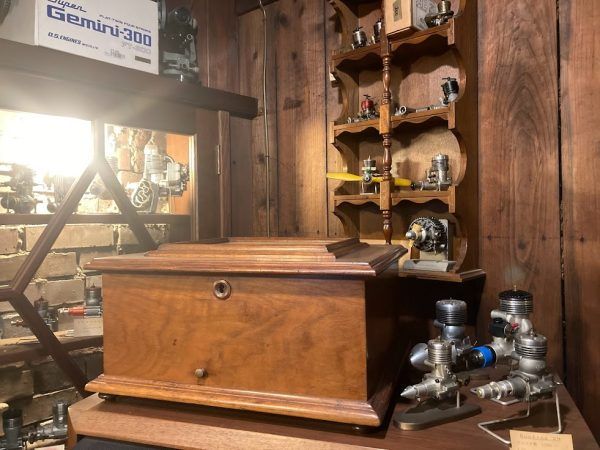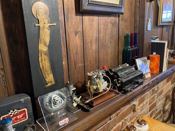オーナーさんは以前、某車メーカーの耐久レースのエンジンにも関わるお仕事をされていたそうで、レアなエンジンも所狭しと飾られています。(飾られているのは模型飛行機のエンジン)