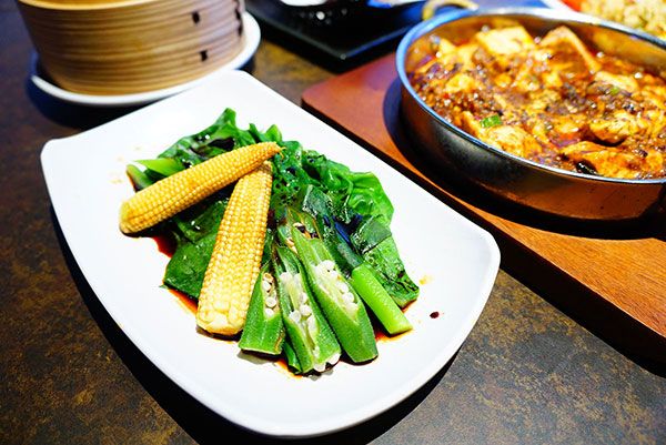 「季節の温菜」(550円)は、 独特の粘りとほろ苦さが特徴であるつるむらさきと、旬のヤングコーンを使用した温菜。つるむらさきは、夏の暑い時期にぴったりなネバネバ食感を楽しめます。