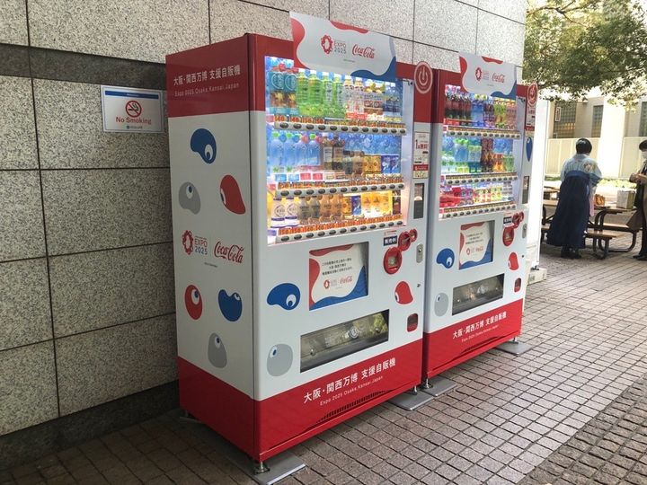 万博のラッピングデザインが施された「大阪・関西万博支援自販機」