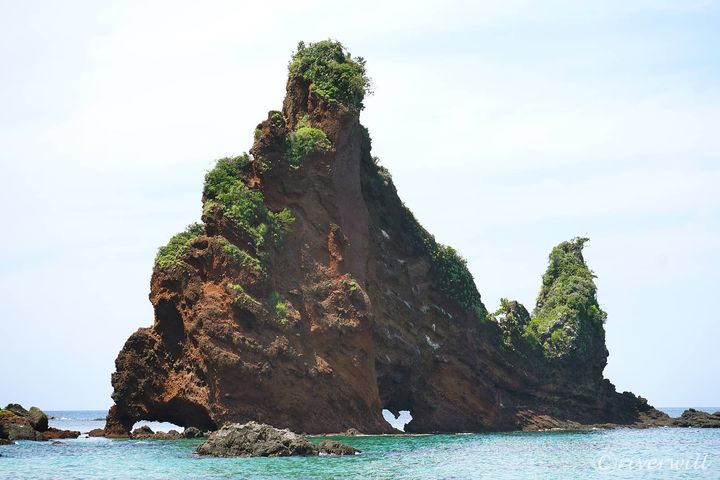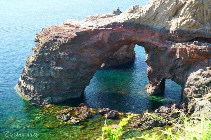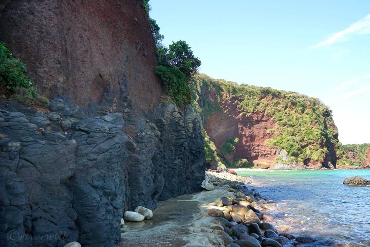 もともとは海蝕作用でうまれた洞窟でしたが、さらなる海蝕で中央部分が崩落し、入口部分だけが残され現在の形状となりました。こちらも、黒や赤のまだら模様の岩質が太古の火山活動を彷彿とさせますね。