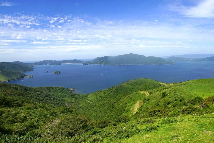 こちらは島前の知夫里島(ちぶりじま)にある「赤ハゲ山展望台」。標高約325mの山頂から一望できるこの絶景は「島前カルデラ」と呼ばれています。