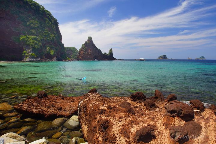 隠岐屈指の透明度を誇るエメラルドグリーンのビーチには、スコリアとともにマグマが固まった黒の溶岩や火山弾と呼ばれる痕跡まで残されていて、確かにここが火山活動の場であったことを示唆しています。