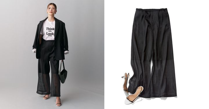 頼りがちな黒パンツは、程よい肌見せができるシースルーで一気に更新感!華奢な細ストラップサンダルで、黒の重さを感じさせない春のモノトーンスタイルを実現。