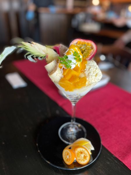 南国ミックスパフェ マンゴーをはじめ、珍しいドラゴンフルーツや酸っぱさが癖になる沖縄のパッションフルーツなど南国フルーツがたっぷりです。