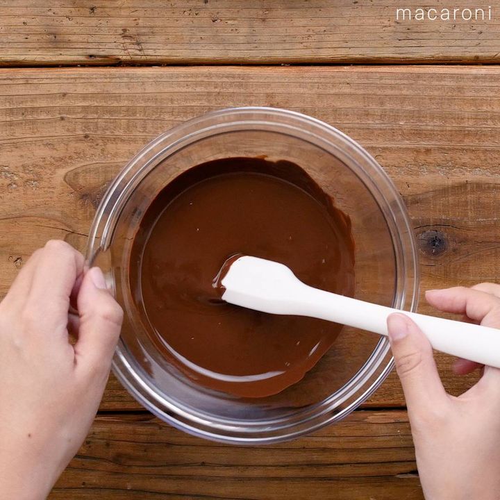 3: チョコレートを耐熱ボウルに入れてレンジ600Wで1分加熱し、混ぜ合わせます。※溶けていない場合は10秒ずつ追加して加熱してください。