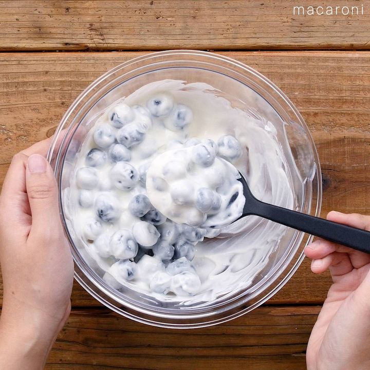 1: ギリシャヨーグルト、ブルーベリー、はちみつを入れて混ぜ合わせます。
