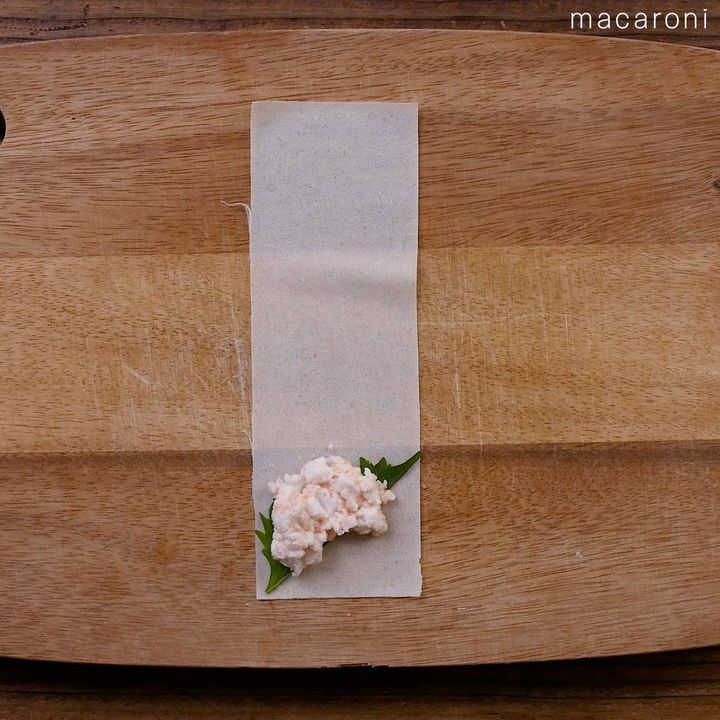 2: 春巻きの皮の上に、大葉をのせ、①を三角形になるようにのせます。