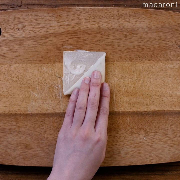 3: パタパタと折りたたむように巻き、巻き終わりを水溶き小麦粉で止めます。