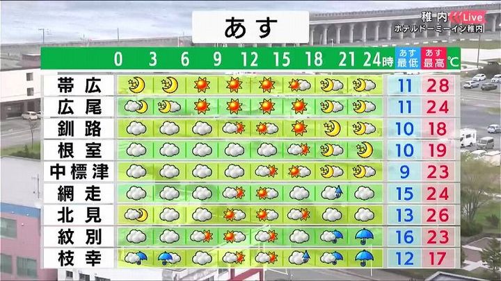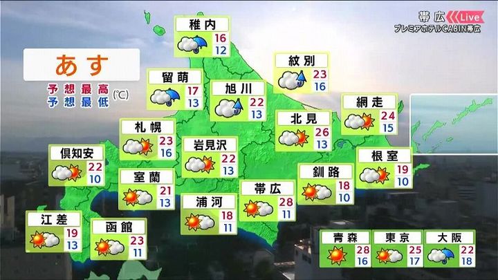 最低気温はけさより5度以上高くなります。最高気温はきょうと同じか2度ほど高く、帯広は28度でしょう。