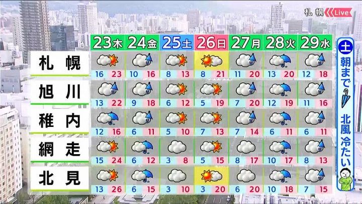 そして土曜は北風が冷たく、札幌の最高気温は13度でしょう。