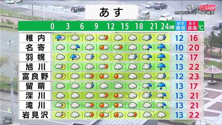 旭川の朝の最低気温は今朝より10度ほど高い13度です。