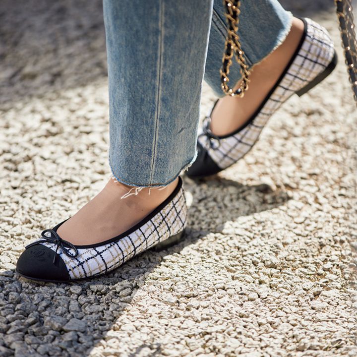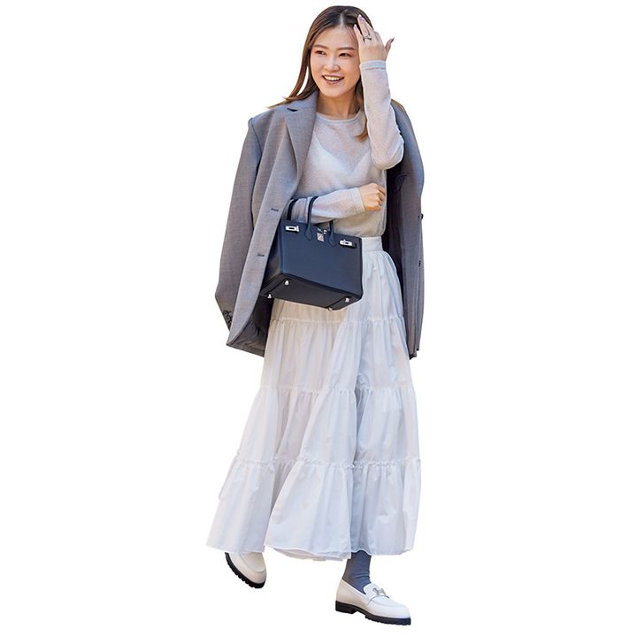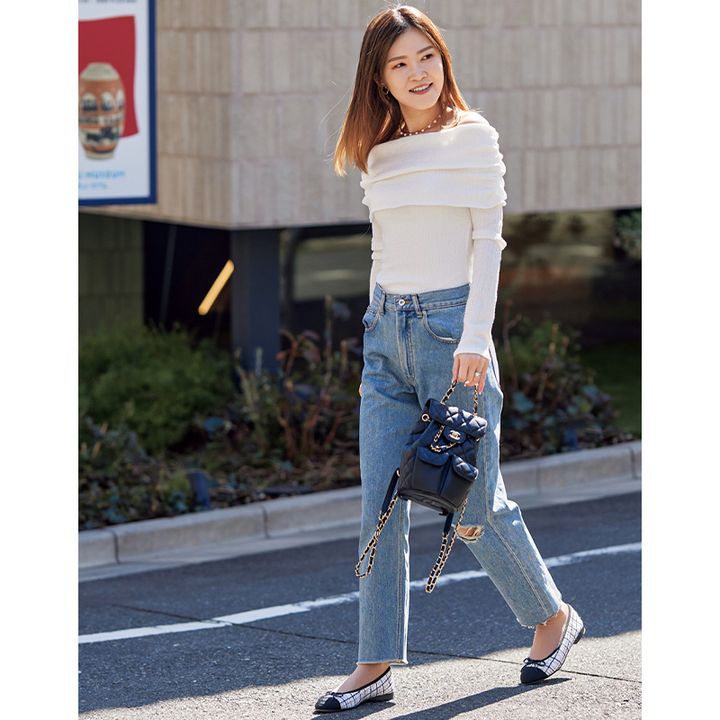 サンバにハマったことから白シューズのコーデのしやすさや、一足で全身を明るく見せてくれる使い勝手に開眼し、今季の靴選びは白が条件に。フットワークの良さはそのままに、どんなキレイめシーンにも対応できるエルメスのローファーとCHANELのツイードバレリーナを買い足しました。春になると穿きたくなるブルーデニムや白スカートとも相性がよく、どちらも長く楽しみたい一足です。