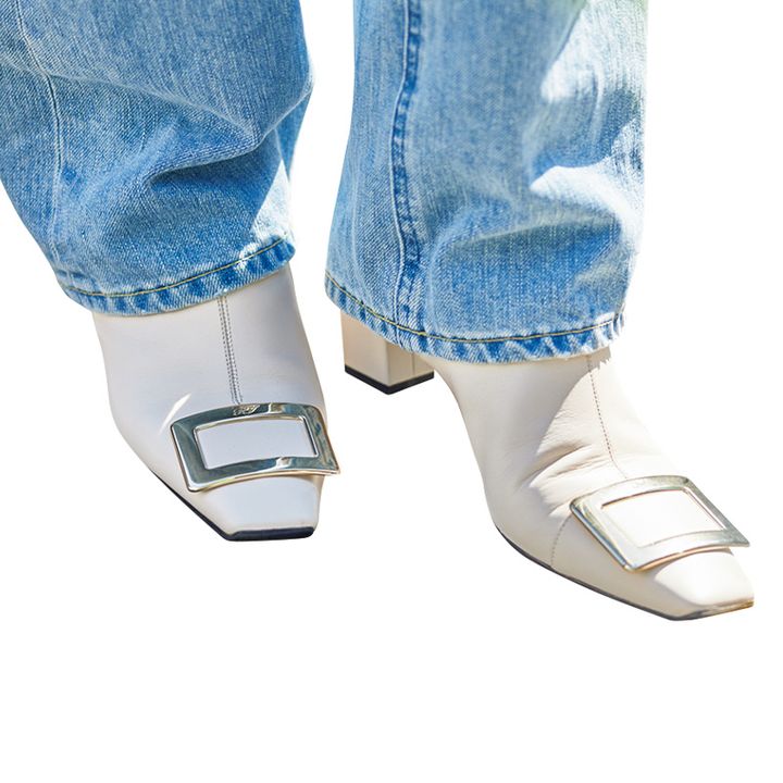 YANUKの細身なストレートデニムなら、キレイめな靴合わせでオフィスにも穿いていかれそう!と思い探し始めた白のシューズ。ロジェのパンプスに狙いを定めていましたが、ついでにはいてみたブーツの安定感とフィット感、そしてコンサバに転びすぎない程よくハンサムな雰囲気に開眼! 遠距離電車通勤もこれなら快適、と即決しました。styling/のイエロートップスとコラムのトレンチでより春らしさをプラス。
