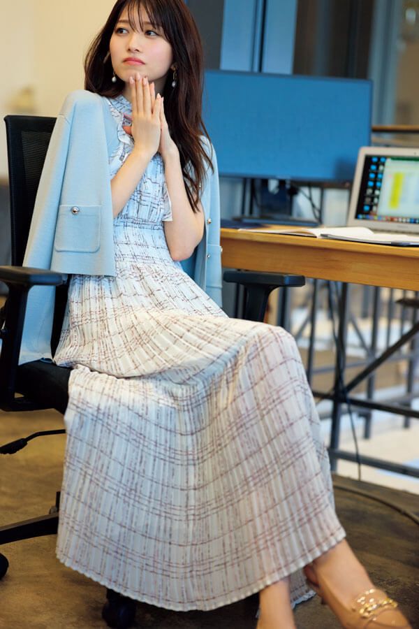 細やかなプリーツの繊細な揺れ感が、淡く儚げなタッチのチェック柄をより可憐に引き立てます。白地のチェック柄ワンピにミント色のカーデを重ねると、目にも涼やかな初夏コーデに。カーデは袖を通さずふんわりと肩に掛けると、のぞく腕の抜け感でこなれ見えします。