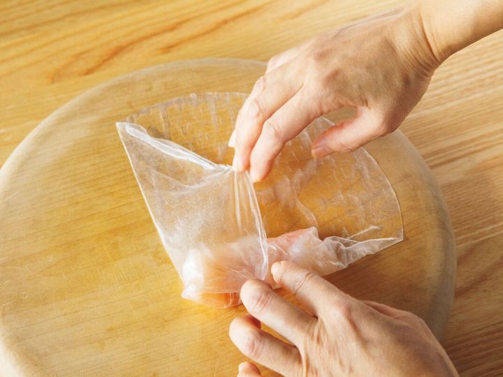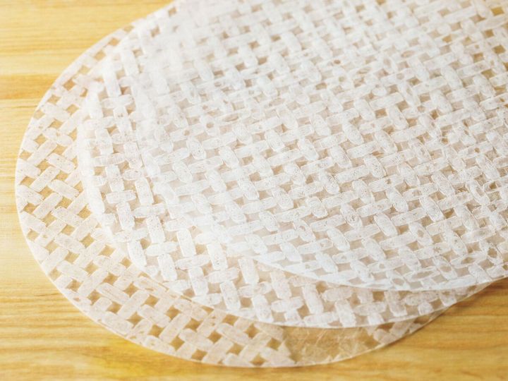 ライスペーパーは、お米を使って作られたシート状の食材。そのまま加熱したり、水にさっとくぐらせるだけで食べられる。今回使ったのは、直径約22cmの円形のもの。 ライスペーパーは水にくぐらせてすぐは完全に水がしみ込んでおらず、割れてしまうことも。少し待って柔らかくなってから包むとうまくいきます。