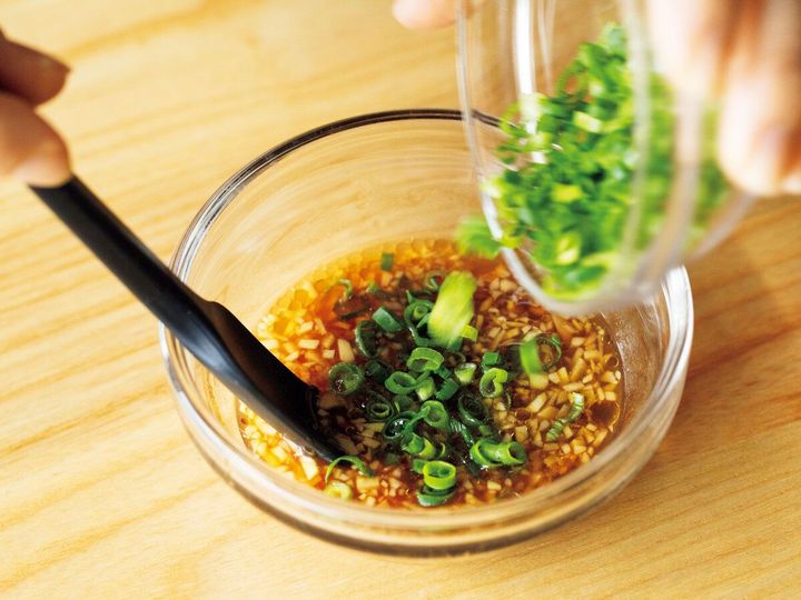 フライパンにオーブン用シートを敷き、2を巻き終わりを下にして間隔をあけて並べ入れ、水大さじ2をふる。ふたをして中火で5分ほど蒸す。器に盛り、香味だれをかける。