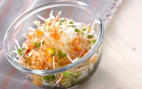 大根のせん切りにかつお節をトッピングし、ポン酢しょうゆを回しかけるだけ。さっぱりとしていて、やみつきになる味です。大根は胃腸の消化吸収を助けるとされているため、豚こま×キャベツガのこってり系のおかずとも好相性ですよ。