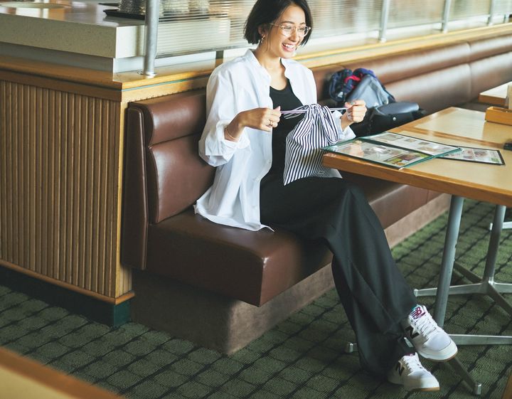 立ったり座ったりの多いシーンではロングスカートが楽ちん。スニーカーでもバランスが取りやすく、きれいめ感を保てるというメリットもあります。