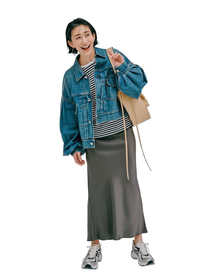 艶スカートでデニムジャケットコーデにきれいめ感がプラス