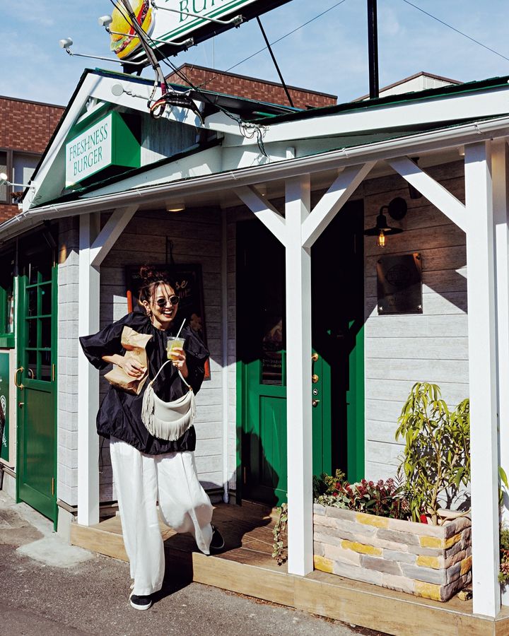 カジュアルに苦手意識のあるキレイめママにはモノトーンのスニーカースタイルを提案。甘めカットソーやシャツを使えば、いつも通りの気分でアウトドア仕様になれます。