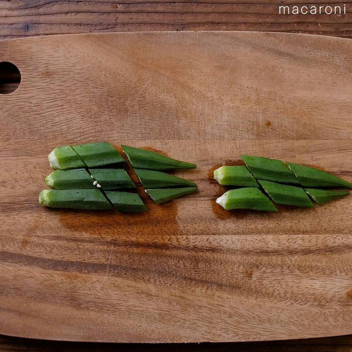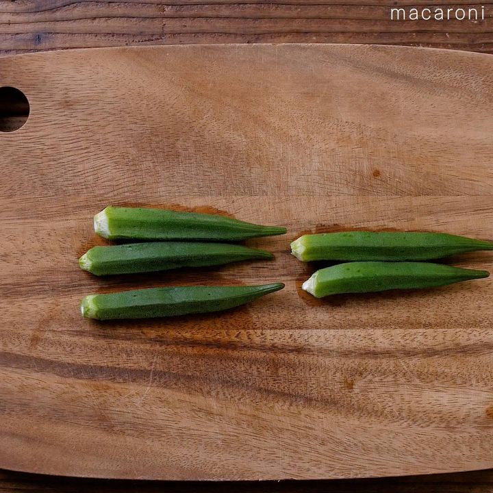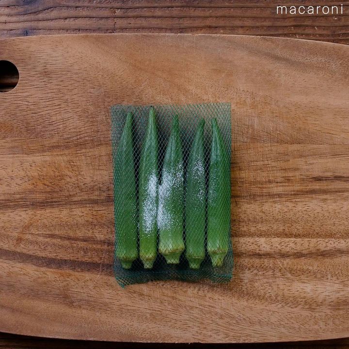 1: オクラはネットに入れたまま塩(分量外)をふって揉み、板ずりします。水で洗い流して水気を拭き取り、ヘタの先を切り落としてガクを取り除きます。
