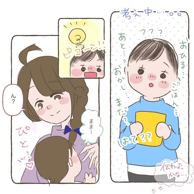 「おひる・・・ごはん・・・あと・・・?おかし・・・まだ?はて??」