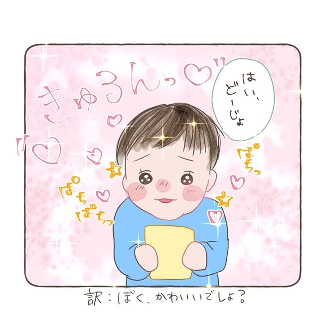 「はい、どーじょ(訳:ぼく、かわいいでしょ?)」