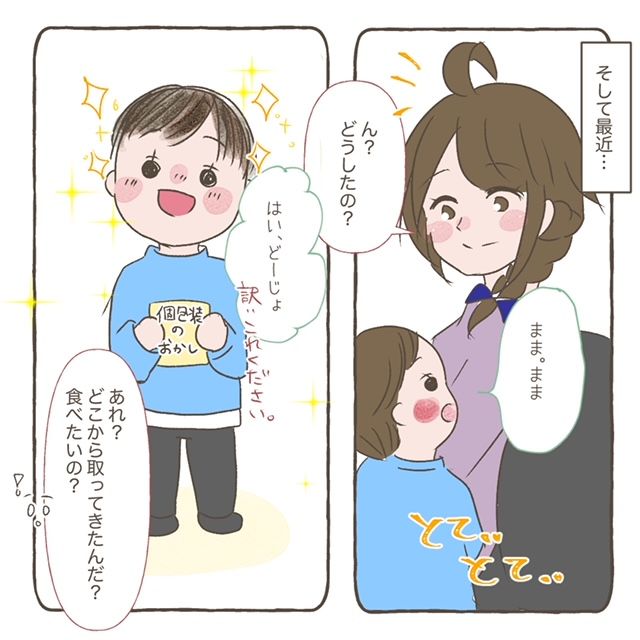 とてとて歩いてきたおかかは、手に個包装のお菓子を持って、