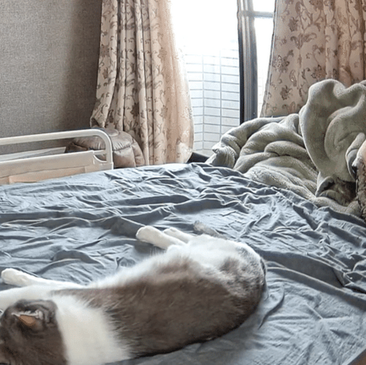 ぬいぐるみのお世話を終えたなだちゃんは、ベッドに寝転んでお昼寝の体勢に。涼しくて快適な空間にぬいぐるみたちを連れてこられて安心したのでしょうか。