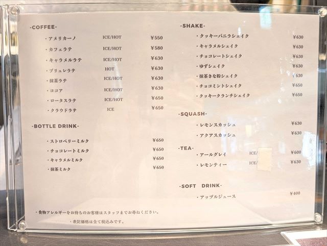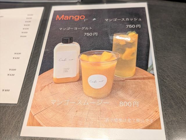 メニューはドリンクがメイン。レギュラーメニューだけでもたくさんの種類があり、シーズンごとに食材が変わる期間限定メニューもあります。5~6月はマンゴーのドリンクでした。