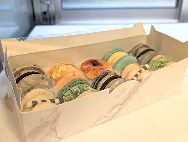 スイーツメニューはチュロスの他に、トゥンカロンがあります(税込430~450円)。カラフルで見た目も華やか……! こちらはイートインだけでなく、テイクアウトも可能です。