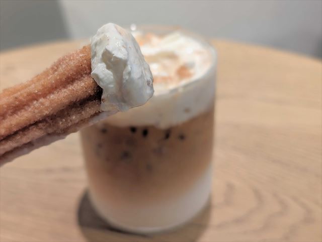 ラテにディップすると、ひと口目のザク感は残りつつ、中がしっとりします。少しひんやりするのが手元の温かさとギャップが出ておもしろい。コーヒーの苦みがチュロスにしみこんで、また違った味が楽しめました。