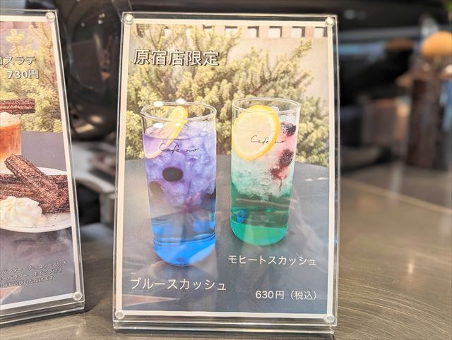 こちらは原宿店限定のドリンク。ブルーハワイをベースにした「ブルースカッシュ」と、モヒートとミントを味わえる「モヒートスカッシュ」の2種類です。色鮮やかで写真映えしそう!