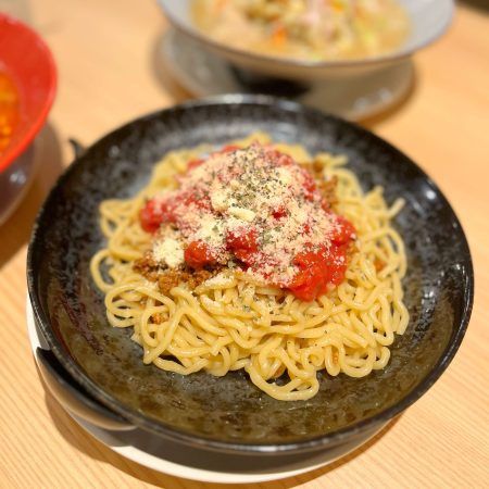 もう一つは変わり種、「ボロネーゼ風和え麺」(990円)を。 こちらの麺は生パスタに似た食感の麺なので、パスタにしてもめっちゃ合います。醤油ベースのソースで和えた麺に、トマトと豚ひき肉たっぷりのボロネーゼ風ソースをかけました。