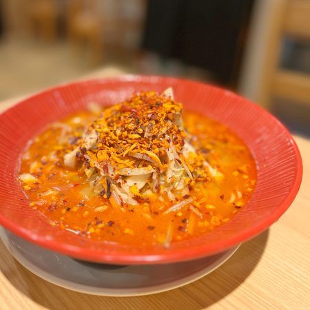 私は、辛いもの好きにはたまらない「激辛極ちゃんぽん」をいただきました。(1100円) 元々メニューにあった「紅辛ちゃんぽん」(1045円)に特製辛味ソース、粗挽き唐辛子、フライドガーリックをトッピング。