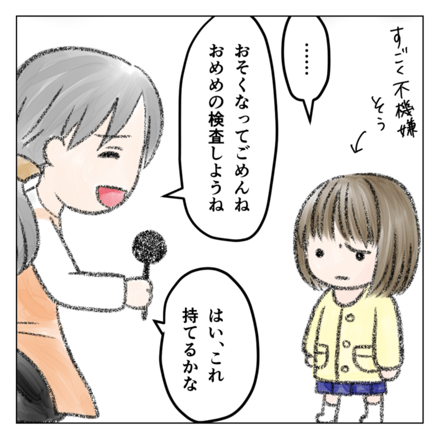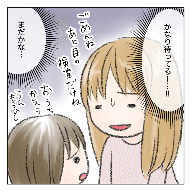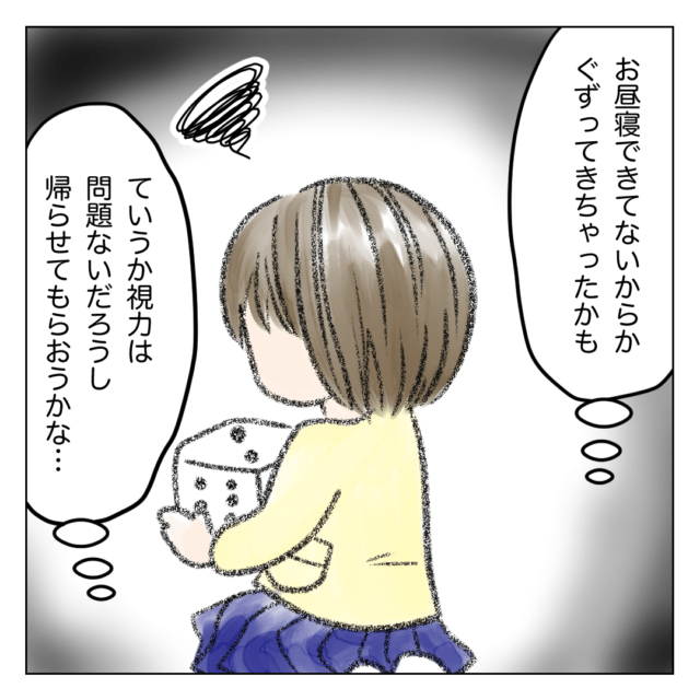 [3]問題ないだろうし帰ろうかな。視力検査でかなり待たされてうんざり。娘の弱視に気づかない|みやーんの育児漫画