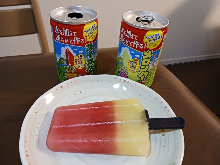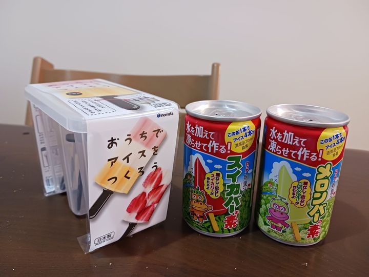 スイカバーの素は赤い部分を作るためのジュースです。わが家は、スイカの皮の部分も作りたかったので、メロンバーの素も一緒に購入しました。