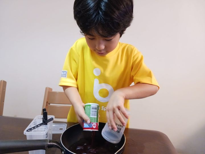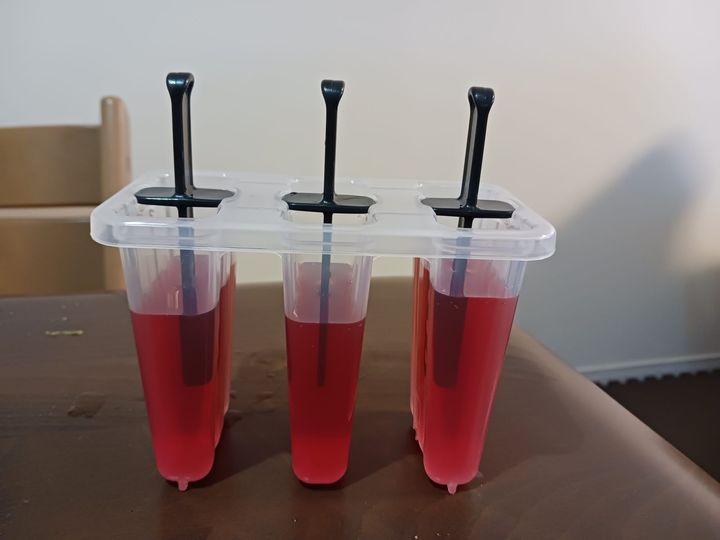 まずスイカバーの素を120mlの水とよく混ぜます。そして、スイカの皮用の空きを残して、容器に注ぎます。