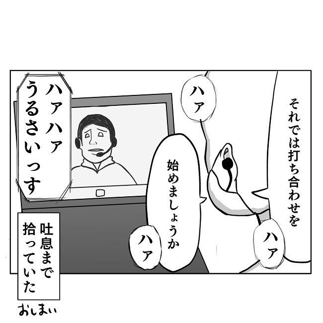 家族に迷惑をかけないためか、カフェなどに出かけてオンライン会議に対応するせせりさん。しかし、周囲の人に自分の声が聞こえるんじゃないかと心配になったそう。そこで、マスクの中にマイク部分を入れて、声が漏れないようひと工夫。しかし、吐息までマイクが拾ってしまい「ハァハァうるさいっす」と相手方に苦笑いされてしまったのでした…。