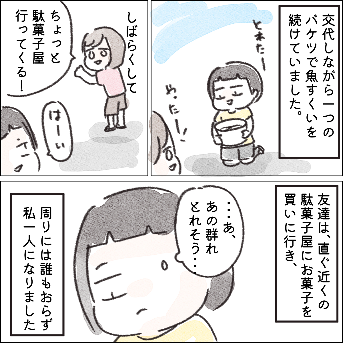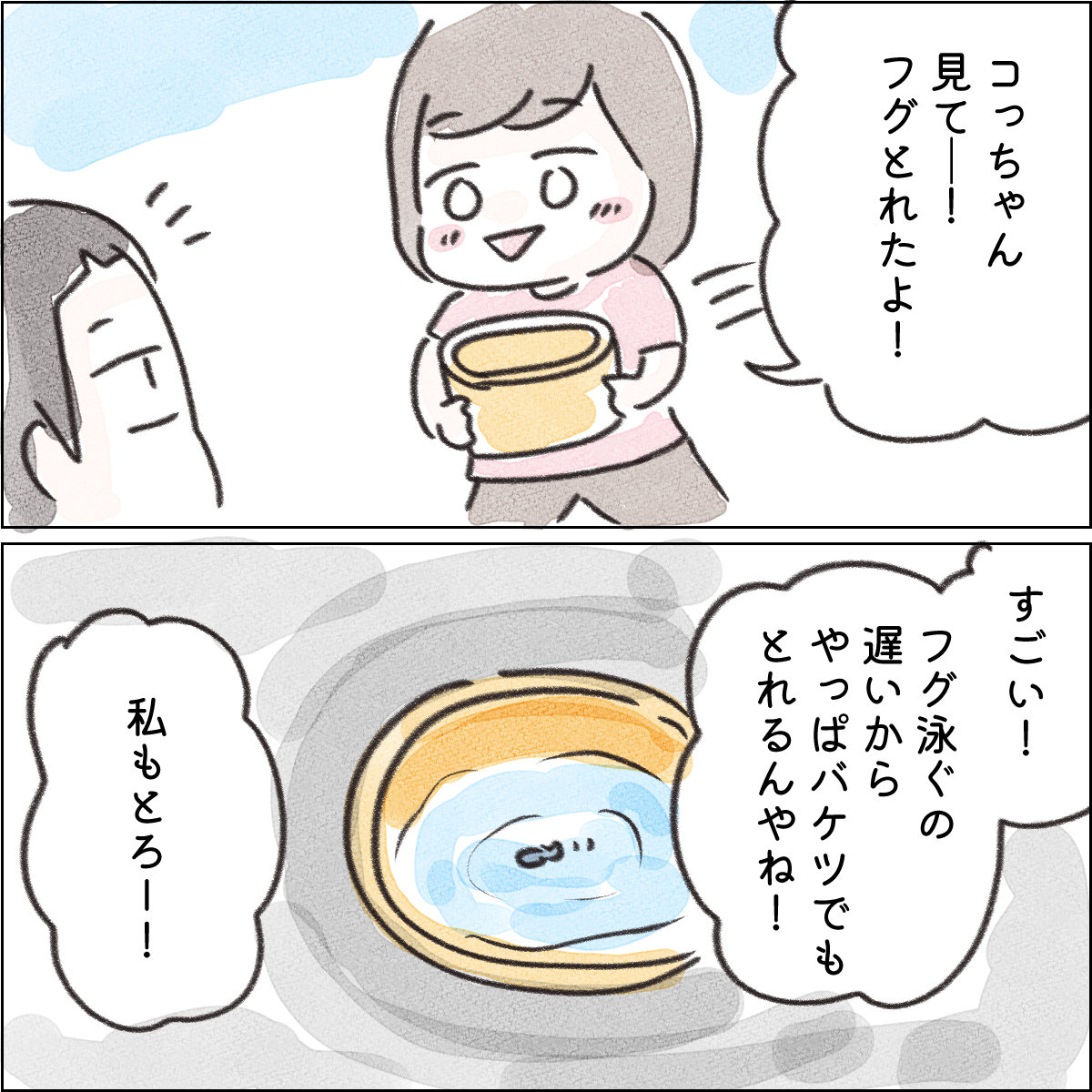 「もう取れんね」と諦めかけた2人でしたが、持っていたバケツですくいます。その時はちょうど潮が満ちていたため、子どもでも地面に寝そべって手を伸ばせば、泳ぎの遅いフグなら取ることができました。そうしてしばらく“魚すくい”を続けていると、友達が「駄菓子屋行ってくる!」と言うので、魚田コットンさんは1人で魚を取ることに…!